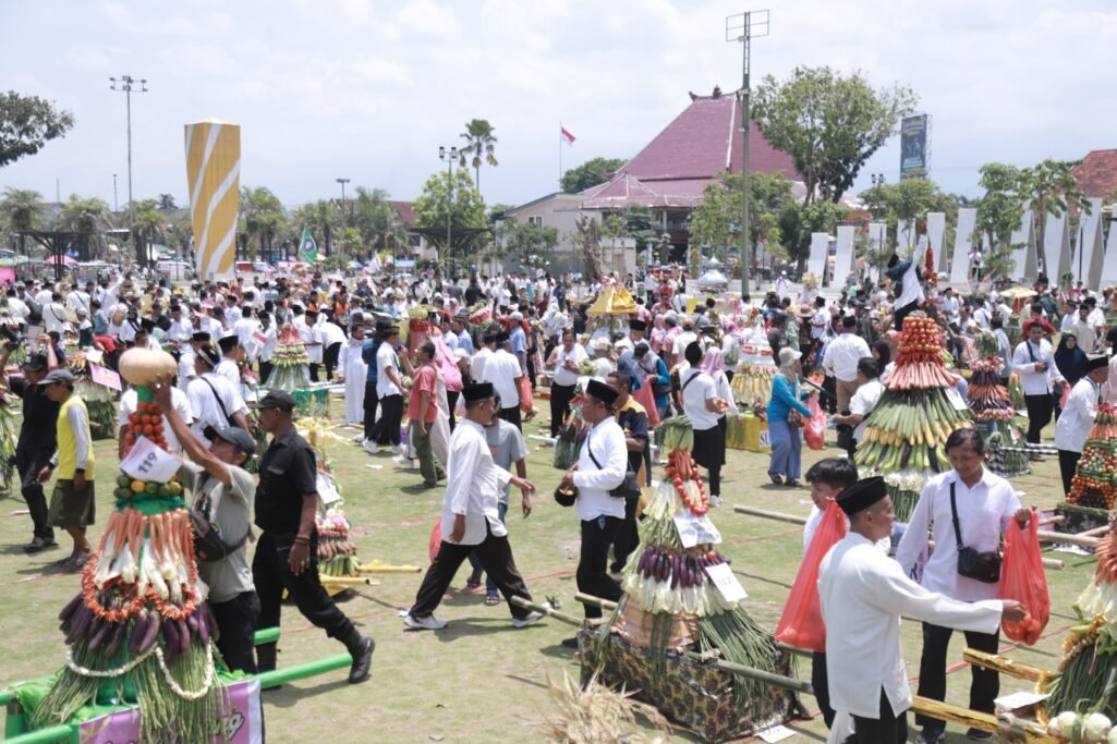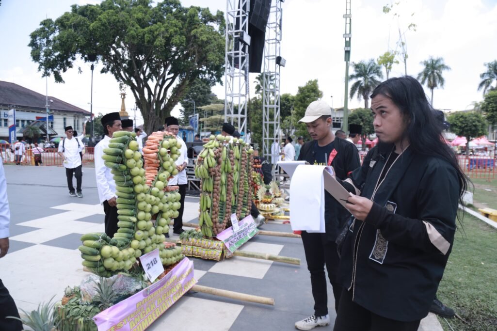 Rangkaian ancak tahun ini benar-benar mencuri perhatian. Hasil bumi yang melimpah, buah-buahan segar, sayur mayur, dan padi ditata dengan rapi menjadi gunungan-gunungan megah. Tak sekadar karya seni, ancak tersebut dihiasi ornamen bernuansa islami, melahirkan pemandangan yang sarat makna spiritual. Dari bentuk burung garuda yang menjulang gagah, hingga lafadz Allah dan Muhammad yang anggun terpampang di tengah alun-alun, seolah menjadi pengingat akan jati diri umat yang selalu berpijak pada nilai keislaman.