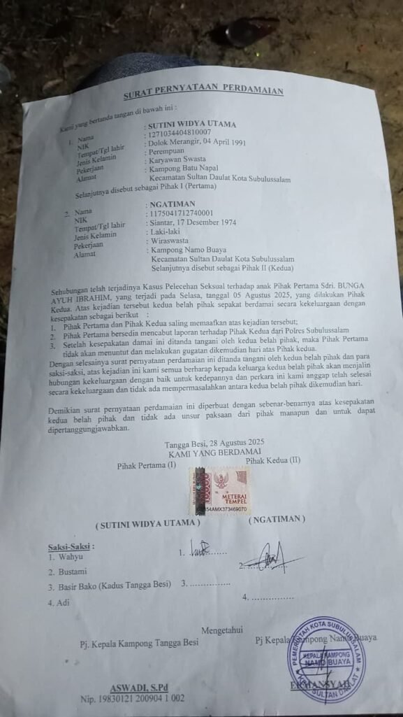 - Antara korban dan pelaku sudah menempuh jalan perdamaian di luar pengadilan, namun Polres Subussalam tetap melakukan penahanan tanpa alasan yang jelas.